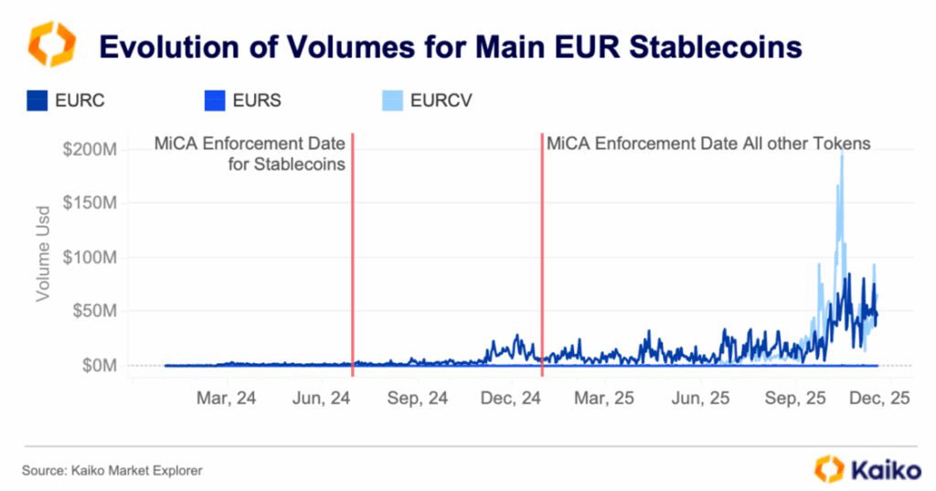 - Migration des Volumes : Si nous observons le volume des principaux stablecoins en euro tels que l’EURC et l’EURCV par rapport à l’EURS (Stasis), nous constatons une évolution significative depuis 2024. L’EURS, bien que deuxième en termes de capitalisation boursière, n’a pas vu son volume augmenter de manière notable. Ce volume est désormais principalement capturé par l’EURC (pour le marché retail/DeFi) et l’EURCV (pour les institutions). Ce marché est encore en plein développement, mais la direction est claire.